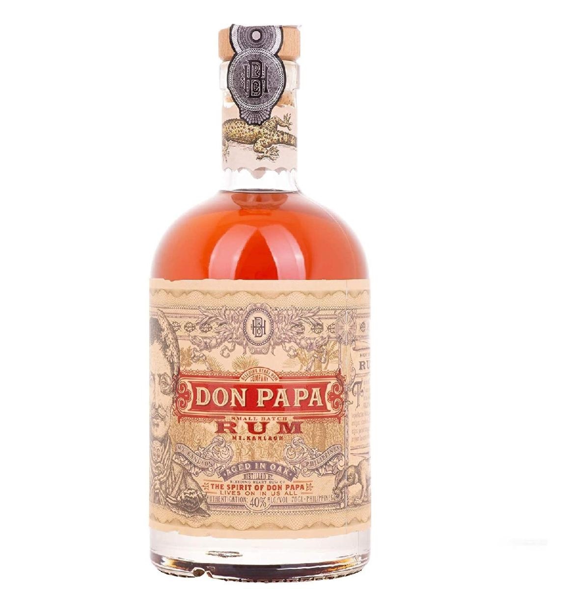 Le canne da zucchero del Rum di Don Papa crescono su terreni prevalentemente vulcanici a piedi del Monte Kanlaon; da questa pregiata canna, si ricava la ricca e impenetrabile melassa definita “Black Gold” che serve da base. Ultimata la distillazione, il Rum viene invecchiato in botti di rovere americano, dove ha riposato il bourbon, il che dona un piacevole sentore di vaniglia. Successivamente le botti vengono stoccate e il distillato viene miscelato con acqua di sorgente del Monte Kanlaon con 40% di alcol. Il risultato è un prodotto dai sentori rari e unici.